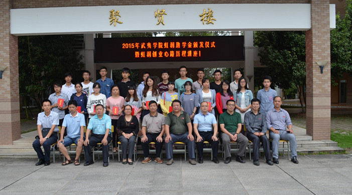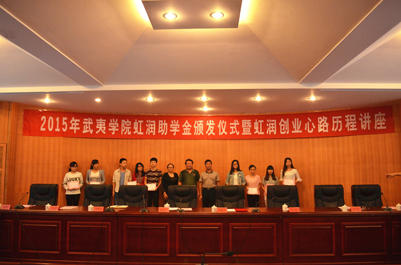 姚進(jìn)生、林善平等與會(huì)領(lǐng)導(dǎo)為獲得虹潤(rùn)助學(xué)金的同學(xué)頒發(fā)了證書。林善平用自己的創(chuàng)業(yè)歷程告訴同學(xué)們要尊重自我,在暫時(shí)的逆境中砥礪品格,磨練意志,用自己的努力不斷增長(zhǎng)知識(shí)和才干,在以后的人生歷程中選擇更輝煌的道路。