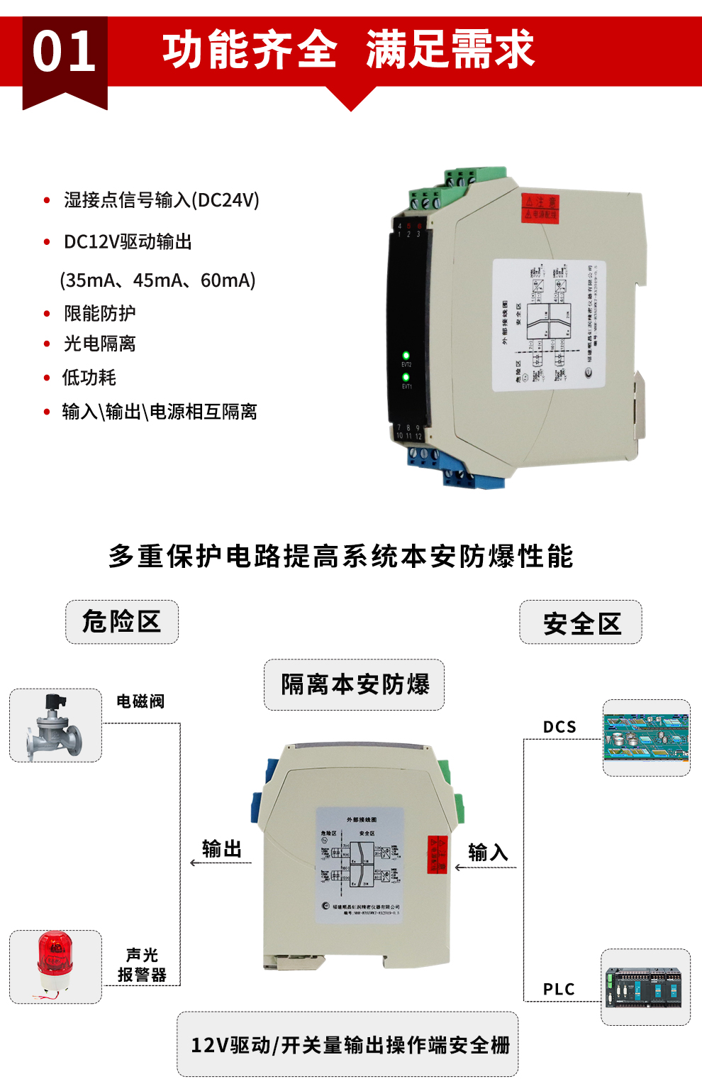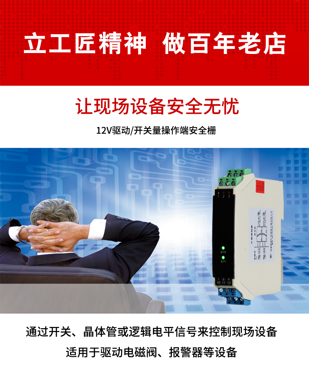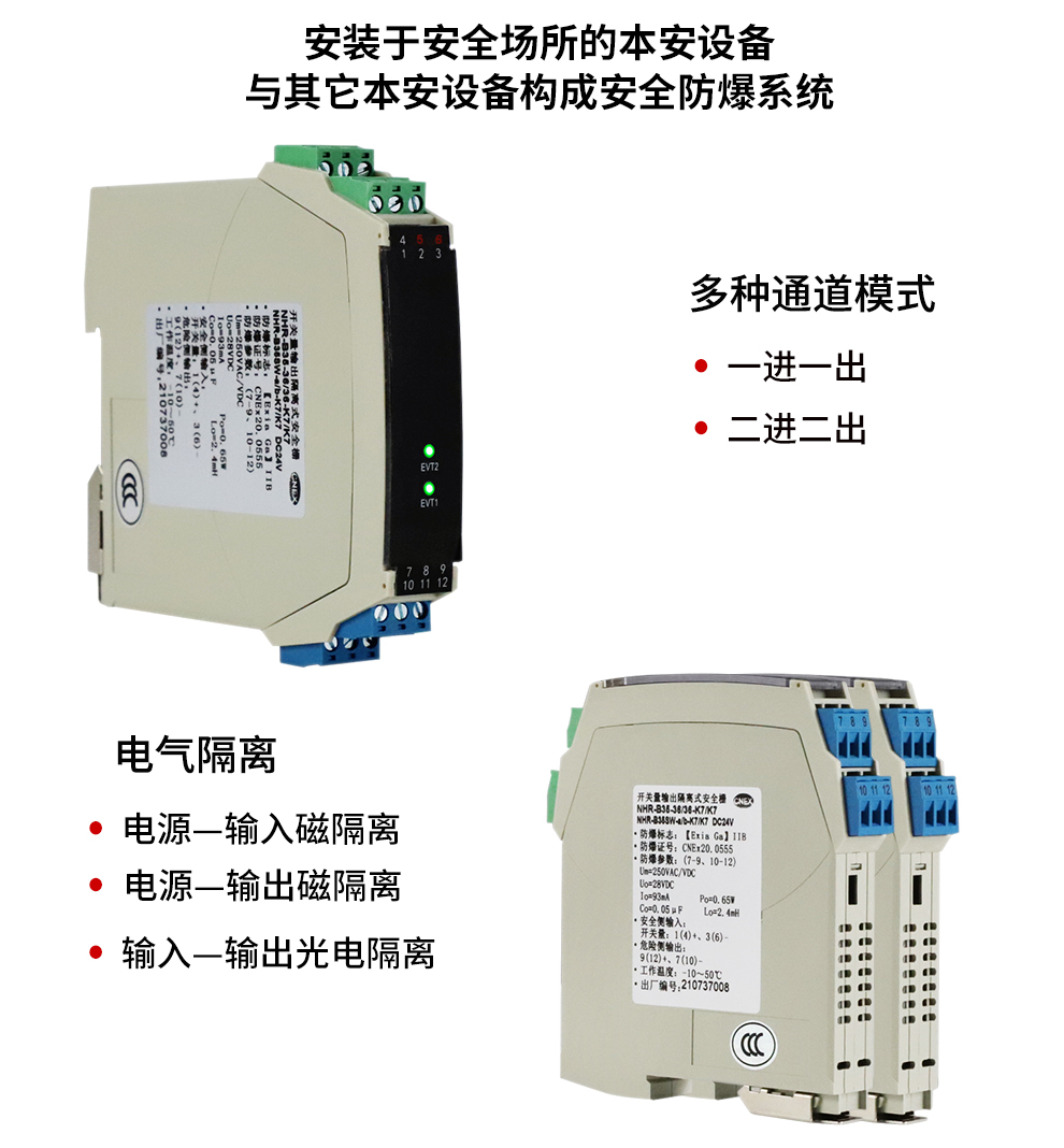 OHR-B35系列12V驅(qū)動(dòng),開(kāi)關(guān)量輸出操作端隔離柵將安全區(qū)的電源通過(guò)開(kāi)關(guān)控制,驅(qū)動(dòng)危險(xiǎn)區(qū)的現(xiàn)場(chǎng)本安設(shè)備,它允許控制開(kāi)關(guān)直接連接到24V供電回路的任一端。本產(chǎn)品適用于驅(qū)動(dòng)如電磁閥、聲光報(bào)警等本安設(shè)備。