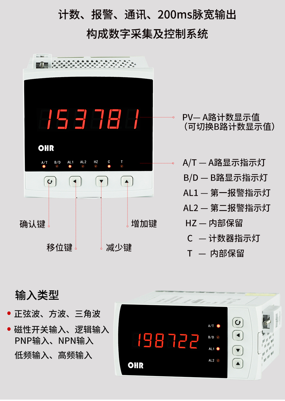 虹潤(rùn)公司是專業(yè)生產(chǎn)計(jì)數(shù)器的國(guó)家專精特新“小巨人”企業(yè)。生產(chǎn)的計(jì)數(shù)器,具有A/B兩路輸入、頻率,轉(zhuǎn)速與計(jì)數(shù)功能切換,報(bào)警繼電器輸出,變送輸出,RS485通訊等特點(diǎn)。產(chǎn)品獲得基于儀表殼體、一種儀表電源等2項(xiàng)國(guó)家發(fā)明專利,主持起草流程工業(yè)中電氣/儀表和控制系統(tǒng)的試車國(guó)家標(biāo)準(zhǔn),通信系統(tǒng)多通道數(shù)據(jù)采集控制終端規(guī)范軍用標(biāo)準(zhǔn),以及現(xiàn)場(chǎng)設(shè)備集成等5項(xiàng)智能制造國(guó)家標(biāo)準(zhǔn)。參與國(guó)際5G標(biāo)準(zhǔn)制定,取得頻率轉(zhuǎn)速儀表等2項(xiàng)相關(guān)軟件著作權(quán)。產(chǎn)品廣泛應(yīng)用于電力系統(tǒng)、機(jī)械制造、汽車工業(yè)、航空航天、船舶海事、冶金礦山等行業(yè)的頻率與轉(zhuǎn)速參數(shù)監(jiān)測(cè)。