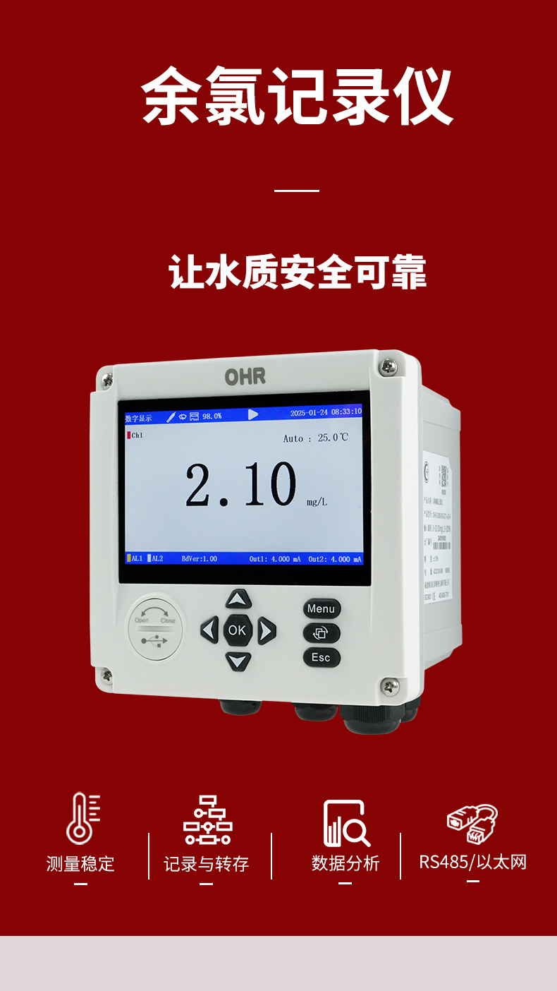 OHR-FCL80系列余氯記錄儀是一款高性能的在線測量儀表,它是一種用于測量水體中余 氯含量的重要儀器,采用恒電壓法,可配置流通池來獲取水體中余氯的含量,特別適用 于泳池水, 飲用水, 二次供水,灌裝瓶裝水等氯消毒處理水的連續(xù)監(jiān)測。