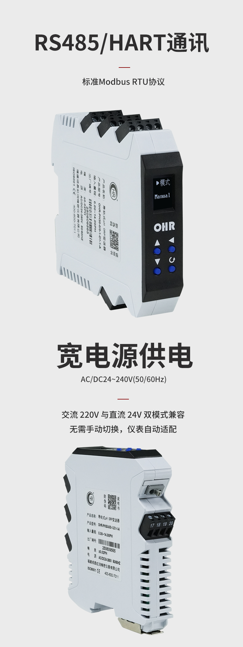 OHR-PH30系列導(dǎo)軌式pH/ORP變送器是一款用于測量水溶液pH值和ORP值的工業(yè)儀表。它將測量信號進(jìn)行隔離處 理與轉(zhuǎn)換,輸出所需信號供其他設(shè)備使用。具有二路模擬信號輸出,一路繼電器報(bào)警輸出,支持RS485通訊 或HART通訊輸出。廣泛應(yīng)用于環(huán)保水處理、純凈水、循環(huán)水、鍋爐水等系統(tǒng)以及電子、電鍍、印染、化學(xué) 、食品、制藥等制程領(lǐng)域。