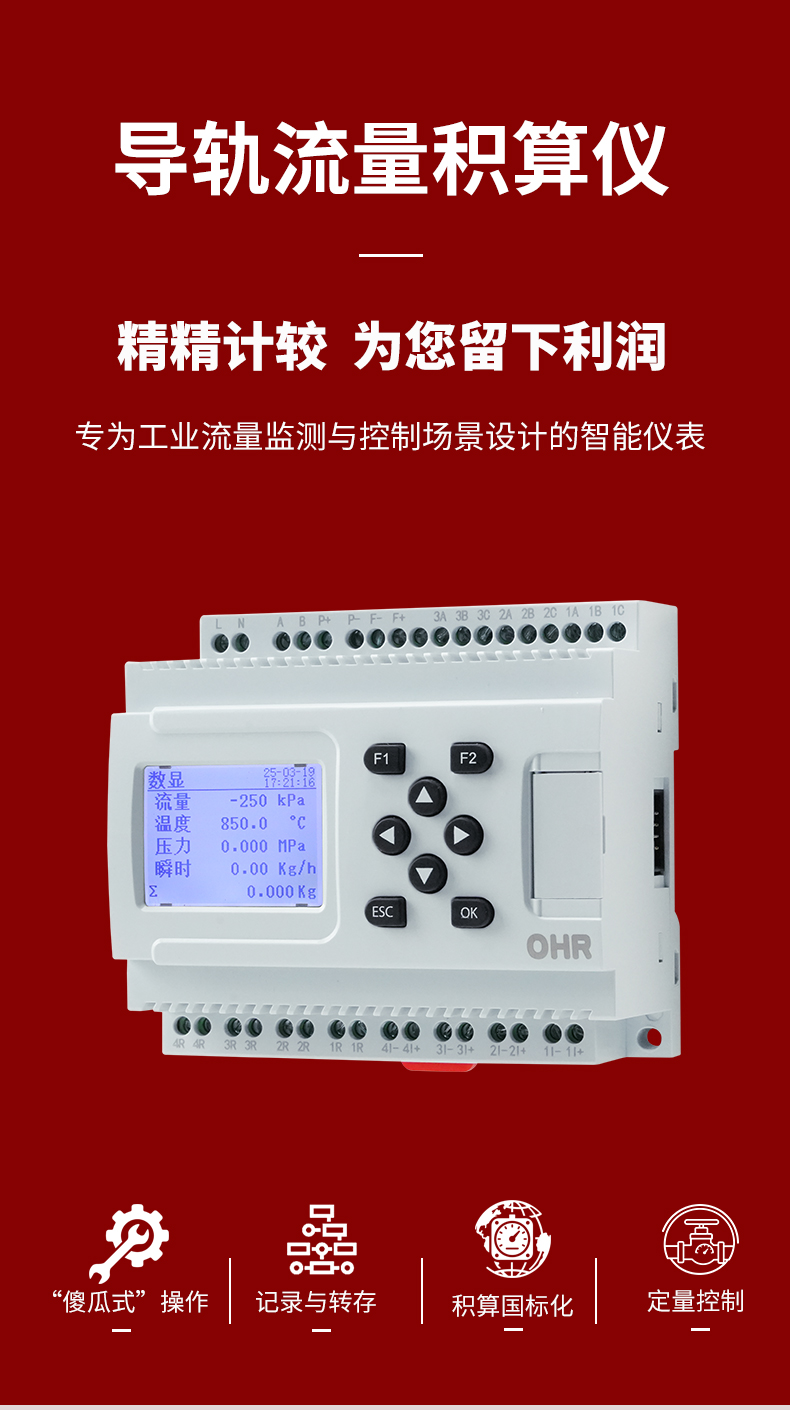 OHR-DN60系列導軌流量積算儀接收來自流量傳感器信號(差壓、脈沖等)、溫度、壓力傳感器的補償信 號實現(xiàn)對氣體、熱水和蒸汽流量進行過程監(jiān)測,總量累積及定量控制。儀表提供全中文簡化設(shè)置菜單,包含有 多種常用流量傳感器、介質(zhì)、可根據(jù)流量計算書輕松對號入座。
